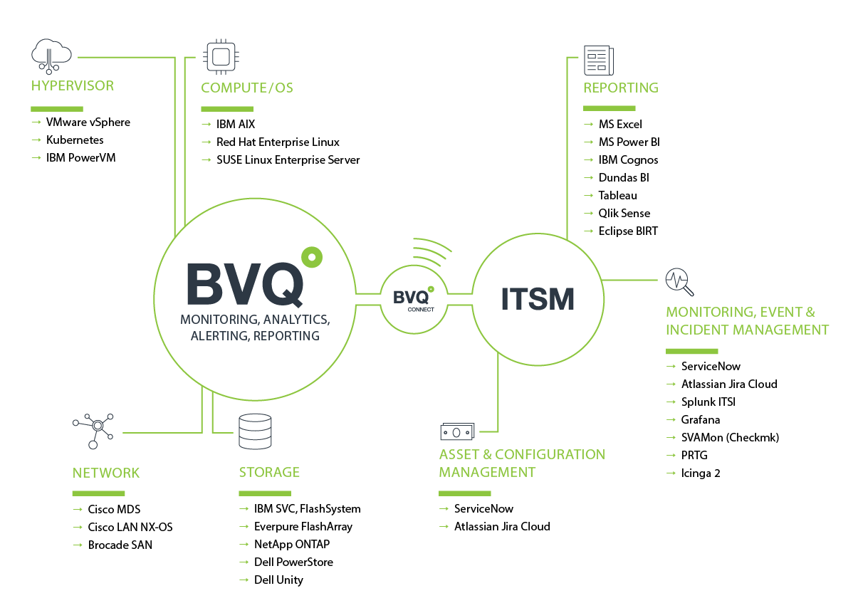 Seamlessly integrate BVQ° performance into your IT service management platforms. Effortlessly connect BVQ° with platforms like ServiceNow, other CMDBs, monitoring tools or ticketing systems. Optimize storage systems, visualize interactions and resolve issues in real time. Track load distribution, identify risks and transform data into valuable ITSM insights. With seamless integration, BVQ° delivers full control and efficiency across your entire IT infrastructure.
