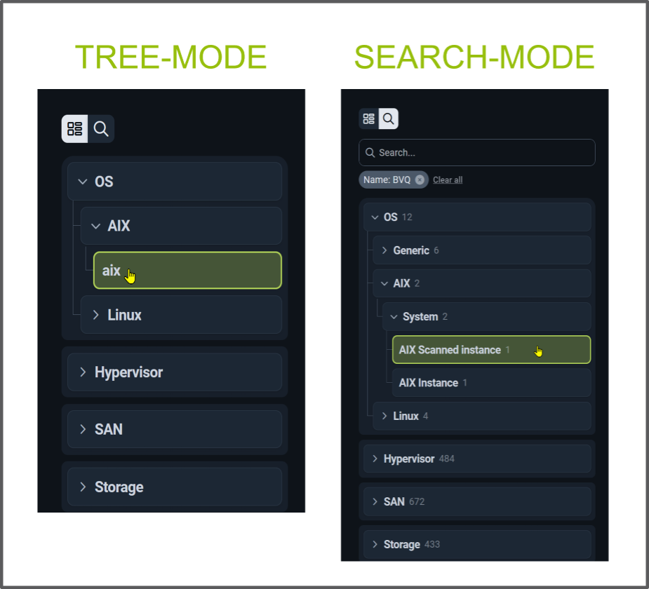 The tree mode allows you to expand layers down to the desired system. Alternatively, the search function enables a full-text search across all objects by name. You can refine results using: